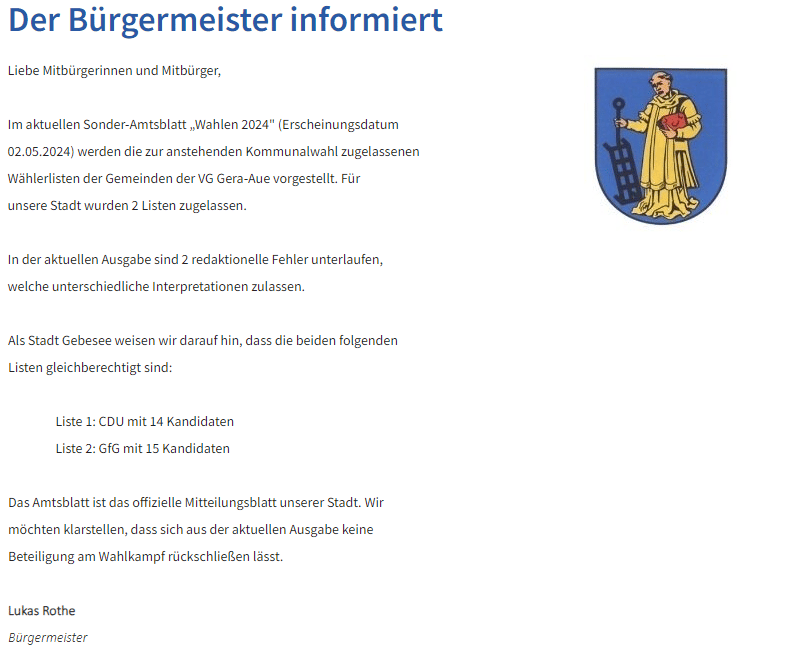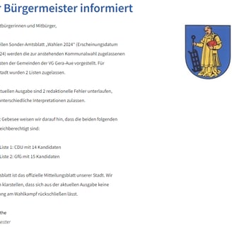 Im aktuellen Sonder-Amtsblatt „Wahlen 2024" (Erscheinungsdatum 02.05.2024) werden die zur anstehenden Kommunalwahl zugelassenen Wählerlisten der Gemeinden der VG Gera-Aue vorgestellt. Für Gebesee wurden 2 Listen zugelassen.